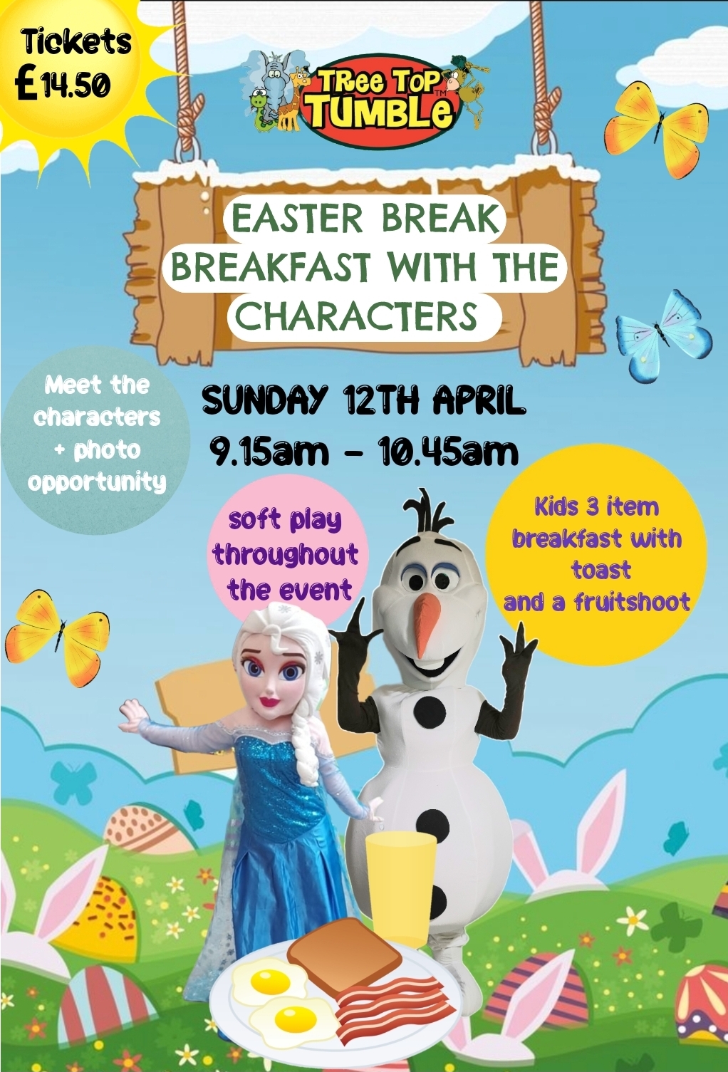 Come along and join us during the Easter break for our breakfast with the characters event. Each child will receive a 3 item breakfast and a slice of toast with a fruit shoot, have access to our Tree Top Tumble soft play area throughout the event and also have a family photo opportunity with our characters. Our Indoor Easter carnival will also be open every weekend during the Easter holidays from 11AM – 3PM – No need to book to visit our carnival, simply buy tokens on arrival.