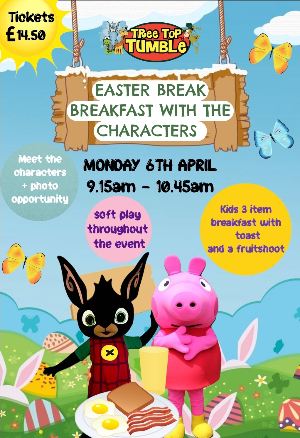 Come along and join us during the Easter break for our breakfast with the characters event. Each child will receive a 3 item breakfast and a slice of toast with a fruit shoot, have access to our Tree Top Tumble soft play area throughout the event and also have a family photo opportunity with our characters. Our Indoor Easter carnival will also be open every weekend during the Easter holidays from 11AM – 3PM – No need to book to visit our carnival, simply buy tokens on arrival.