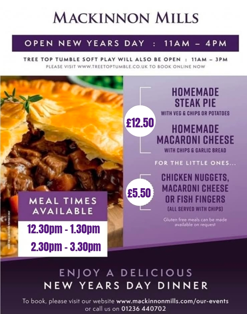 Come along and join us here at Mackinnon Mills and let us do the cooking and start 2026 with a delicious traditional homemade dinner for the full family. We are delighted to offer our delicious famous Steak Pie served with chips or potatoes and veg , or Our home made macaroni cheese served with Garlic bread and chips for just £12.50. For your little ones we have Chicken nuggets, macaroni cheese or fish fingers all served with chips and a fruit shoot for just £5.50. We have 3 time slots available to book, Please select the drop down box below and select what time you will like to attend for your meal. gluten free meals can be made available on request.