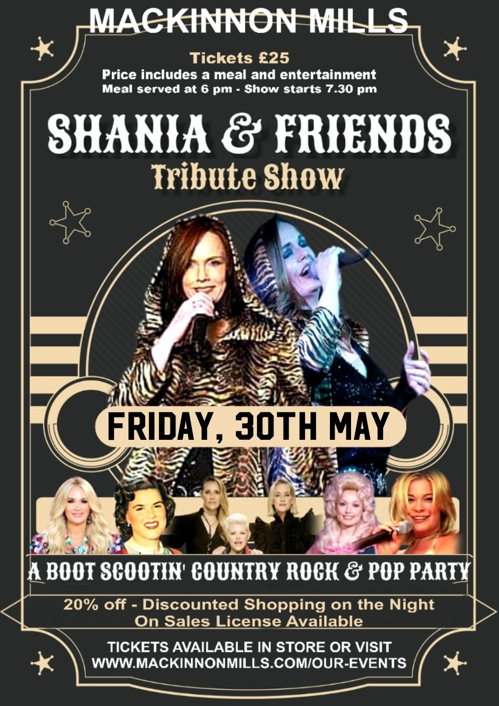 Come along and join us for what is sure to be a fantastic feel good sing along evening with our upcoming Shania Twain and friends tribute evening on Friday 30th May. Extremely limited tickets – BOOK NOW TO AVOID DISAPPOINTMENT !!