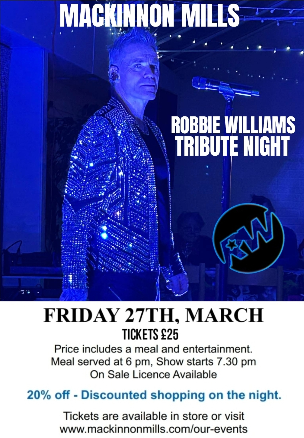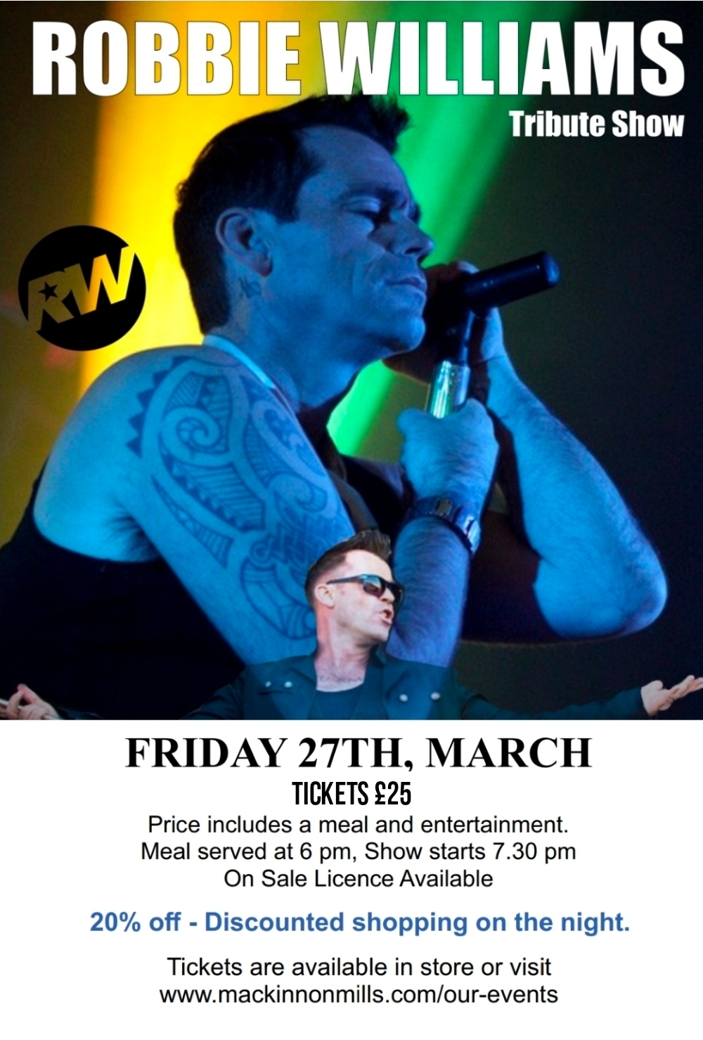 The meal will be served at 6pm followed by discounted shopping until 7:30pm when our Robbie Williams tribute show will begin.