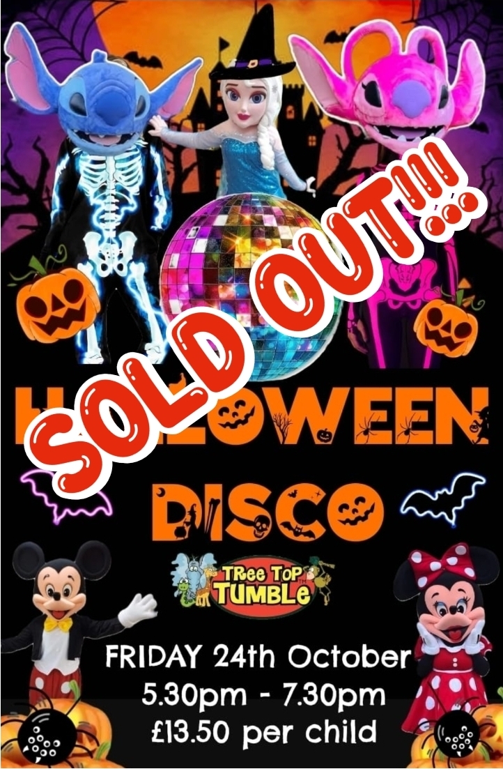 On Friday 24th of October 5.30pm  -7.30pm, Come along dressed for the occasion and join us for a Spooktacular fun filled disco evening with the characters. There will be Disco lights, singing and dancing plus plenty of photo opportunities with the characters. Tickets for this event cost £13.50 per child which include : kids meal option, 2 hours access to Tree Top Tumble soft play, Meet the characters plus disco music, lights and games. You will be asked for your menu options within this online booking process, Pease select and type from our menu options below when asked :