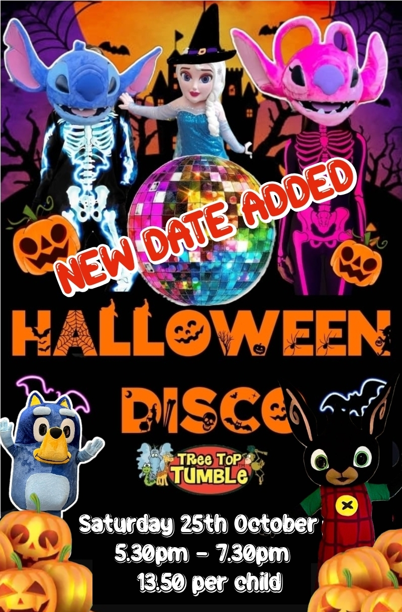 Due to popular demand and original date selling out we’ve we added another Halloween disco on  Saturday 25th of October 5.30pm  -7.30pm. Come along dressed for the occasion and join us for a Spooktacular fun filled disco evening with the characters. There will be Disco lights, singing and dancing plus plenty of photo opportunities with the characters. Tickets for this event cost £13.50 per child which include : kids meal option, 2 hours access to Tree Top Tumble soft play, Meet the characters plus disco music, lights and games. You will be asked for your menu options within this online booking process, Pease select and type from our menu options below when asked :