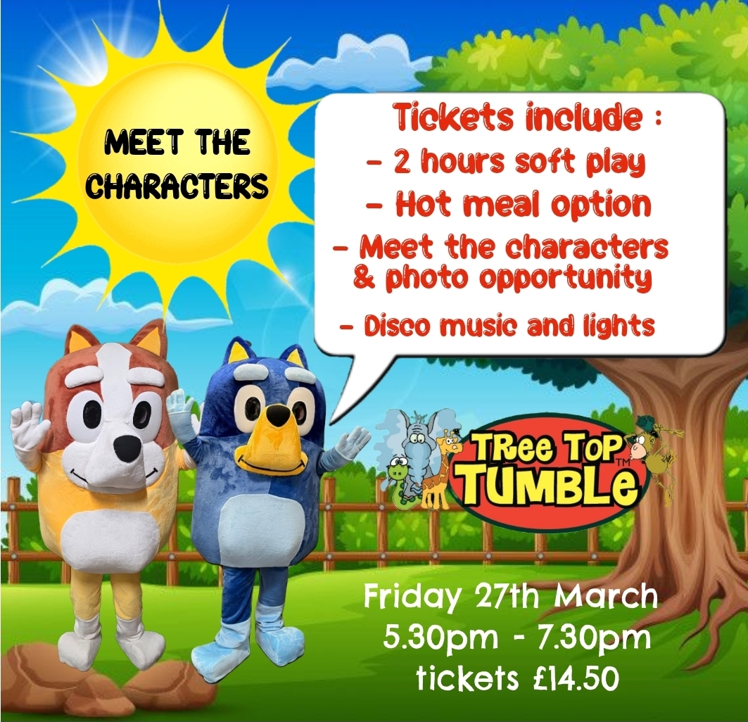 On Friday 27th of March from 5.30pm -7.30pm, Come along and enjoy a night of soft play, delicious hot meal and meet the characters. There will be Disco lights, singing and dancing plus plenty of photo opportunities with the characters. Tickets for this event cost £14.50 per child which include : kids meal option, 2 hours access to Tree Top Tumble soft play, Meet the characters plus disco music, lights and games. You will be asked for your menu options within this online booking process, Pease select and type from our menu options below when asked :