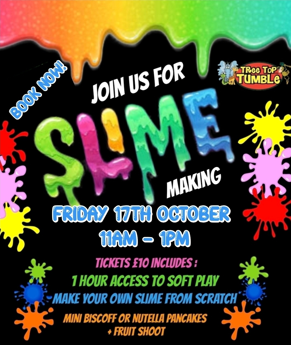Come along and make your own slime from scratch this October holidays!! We have a fun and messy slime making afternoon planned that your little ones won’t forget . Tickets include Slime making, 1 hours access to Tree Top Tumble soft play and a snack of Mini Biscoff or Nutella pancakes and a juice. (not recommended for children under 36 months)