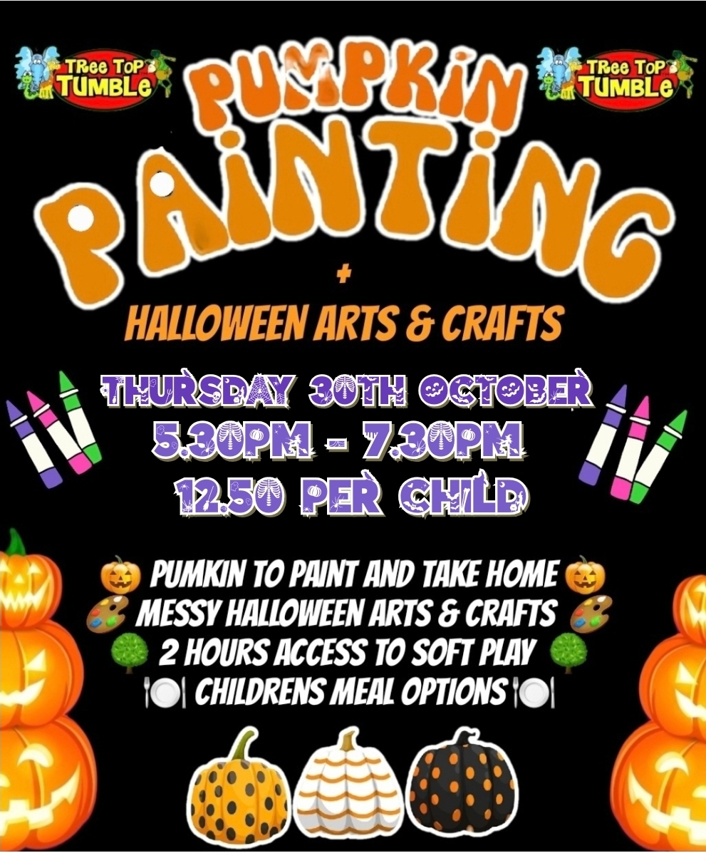 🎃Come along and join us with our pumpkin painting and messy Halloween arts and crafts. Tickets cost £12.50 per child and each ticket includes, A pumpkin to paint and decorate and take home, 2 Access to Tree Top Tumble throughout the event, creative fun & messy Halloween arts and crafts to take home and also a child’s meal option. There is no charge for adults to attend this event and meal options will be made available on the day of the event for adults to eat at their leisure 🎃